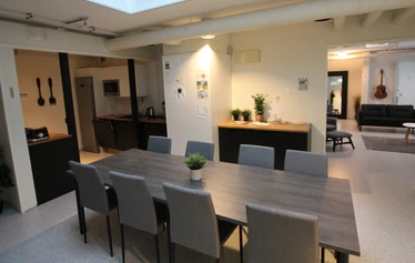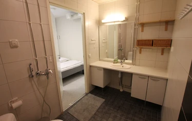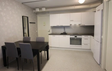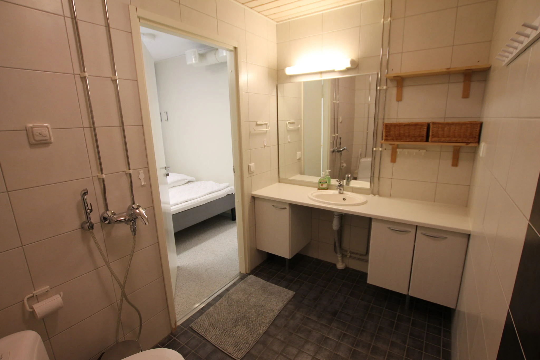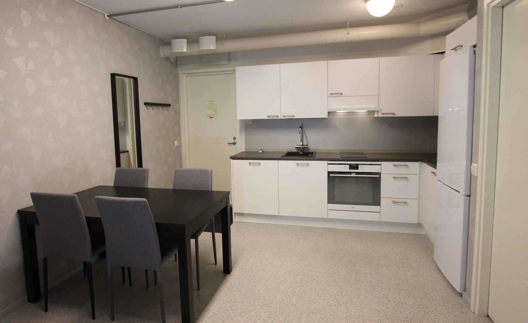 Perhehuoneessa on oma kylpyhuone sekä nykyaikainen keittiö astianpesukoneella.